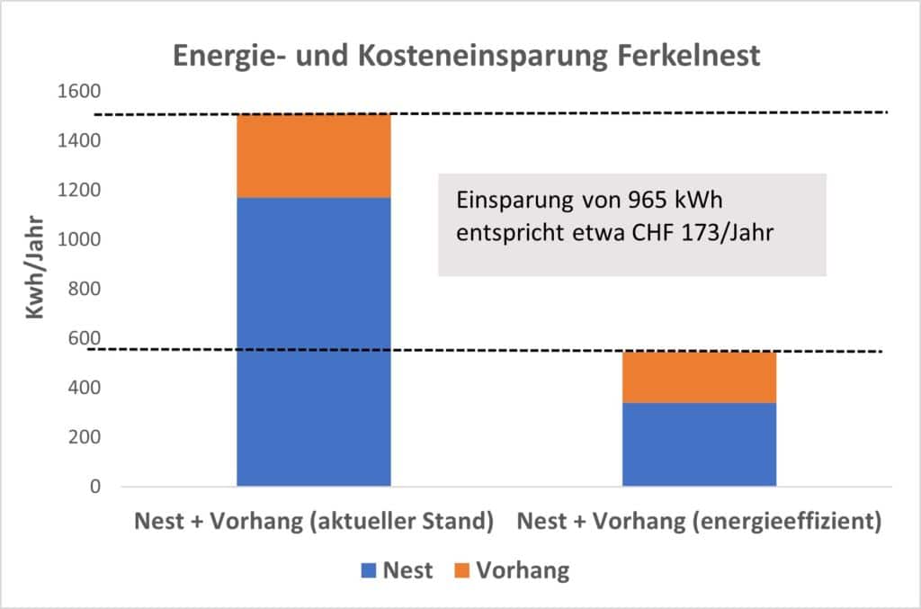 Im Durchschnitt hat ein Schweinestall zehn Ferkelnester und spart mit der Installation solcher energieeffizienter Einrichtungen etwa 10’000 kWh Strom pro Jahr (2’000 CHF/Jahr). Das Einsparpotenzial ist gross, da es in der Schweiz etwa 2200 Zuchtschweineställe gibt.