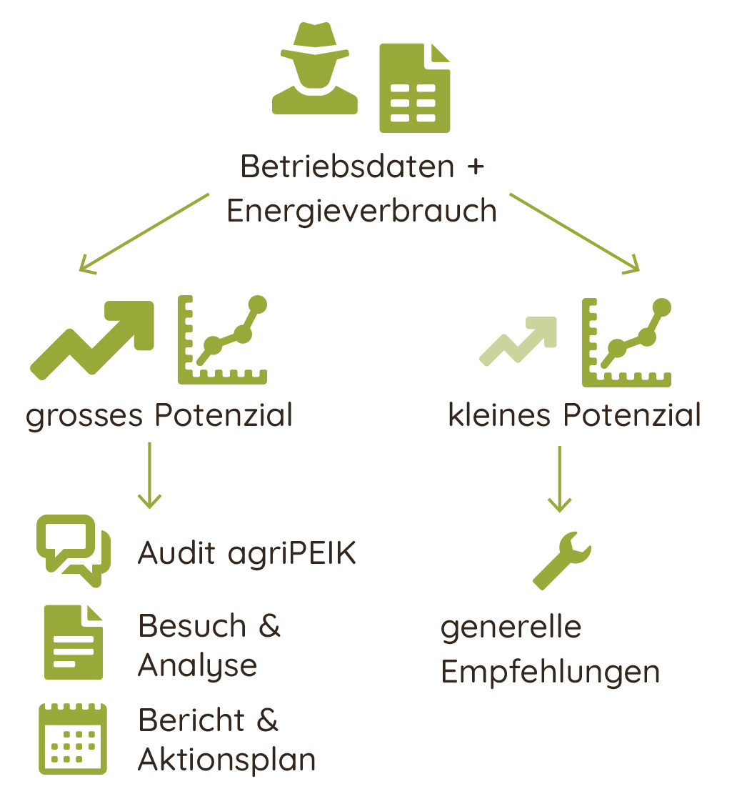 In diesem ersten Schritt werden Energieeinsparpotenziale ermittelt, indem Ihr Energieverbrauch mit einem berechneten Referenzstandard verglichen wird. Resultiert aus dem Check grosses Einsparpotenzial, wird ein vertieftes agriPEIK-Audit vorgeschlagen (inkl. Offerte für agriPEIK-Audit).