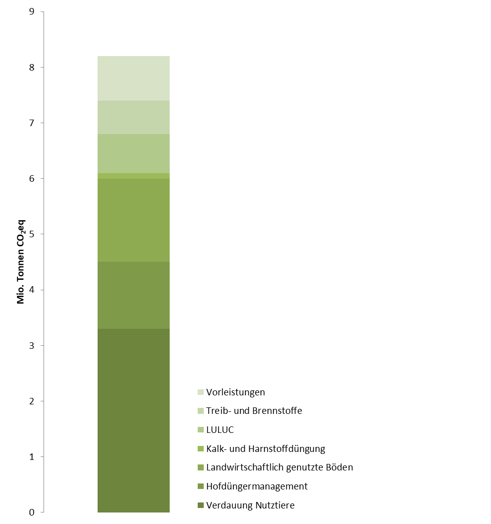 En 2015, la part de l’agriculture aux émissions de gaz à effet de serre de la Suisse était d’environ 13 %, soit 8,2 millions de tonnes CO2eq. Ces émissions se composent des sources suivantes: