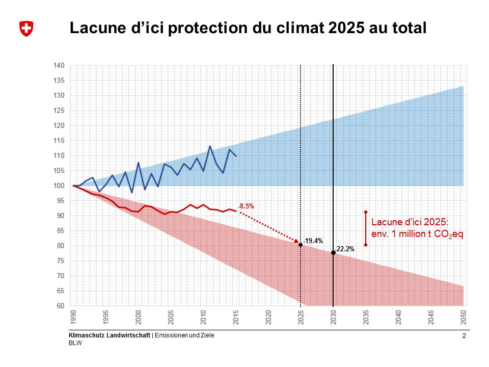 En 2011, l'OFAG a élaboré la Stratégie Climat OFAG afin de préparer l’agriculture aux futurs défis et tâches liés au réchauffement climatique. L’objectif de la stratégie est de réduire les émissions agricoles d’un tiers d’ici à 2050 (à environ 6 millions de tonnes ) par rapport à 1990 (8,9 millions de tonnes ). Il existe actuellement une lacune d’environ 1 million de tonnes à combler d’ici 2025.